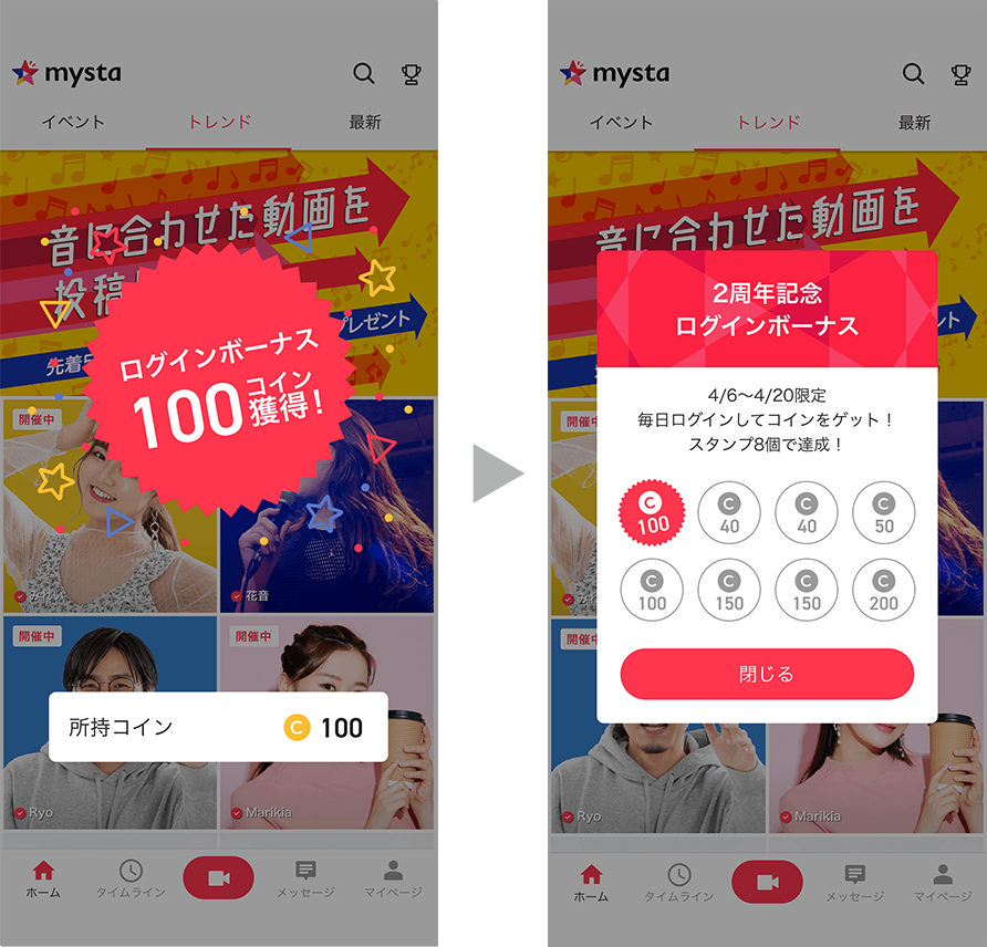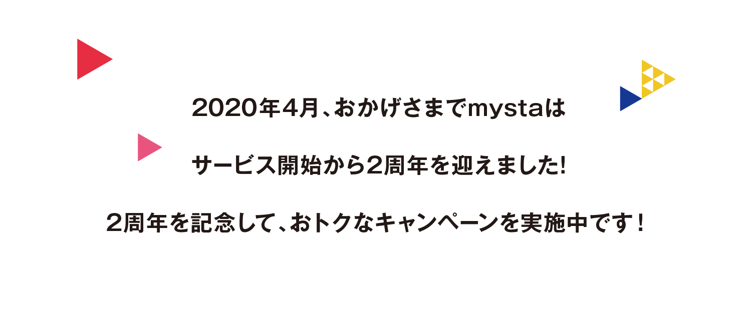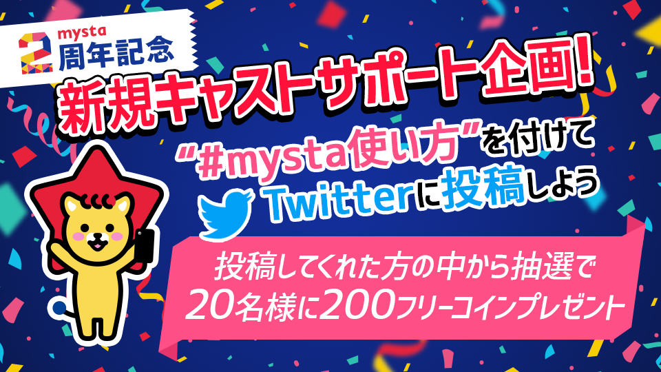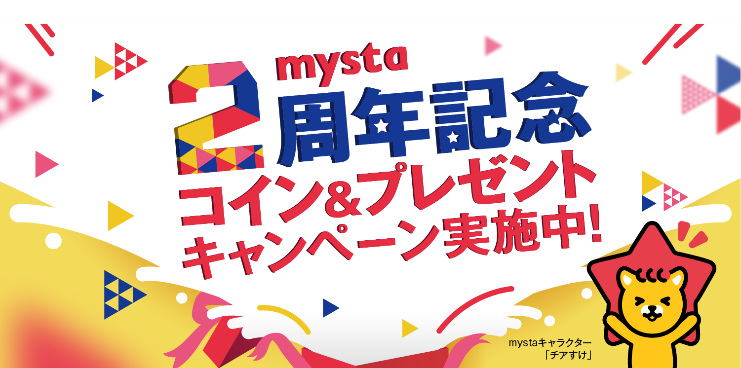 2020年4月6日 アプリ2周年記念キャンペーン 期間限定!コインがお得に買えるキャンペーンを開催!いつもと同じ金額でよりたくさんコインがもらえる!コインを買うなら今がお得♪この機会に、コインをもらってたくさんトクしちゃおう! 実施期間:2020.4.19(日)18:00〜4.21(火)18:00まで 2周年記念の感謝の気持ちを込めて全員に100コイン配布!マイページの「コイン履歴」から確認しよう! 実施期間:2020.4.6(月)16:00〜4.20(月)23:59まで 期間中にログインしてくれた方に8回までフリーコインを配布!合計で最大830コインがもらえます! 実施期間:2020.4.6(月)16:00〜4.20(月)23:59まで ※SMS認証済みの方が対象になります。 ※毎日0時に更新されます。 ルーキー応援機能がこの期間だけパワーアップ!お気に入りのキャストを見つけよう ルーキー応援機能の詳細はこちら 実施期間:2020.4.6(月)00:00〜4.20(月)23:59まで Twitterに #mysta使い方 を付けて、mystaの投稿方法や勝つための 攻略法を投稿。 投稿してくれた方の中から抽選で20名様に 200フリーコインプレゼント! これからmystaを始める人に先輩方からアドバイスをお願いします! 投稿方法、ファンの集め方など新規キャストの役立つ情報なら何でもOK! 実施期間:2020.4.6(月)16:00〜4.20(月)23:59まで 新ギフトシャンパンの追加を記念して、期間中一番シャンパンギフトを贈られたキャストをmystaのTwitterの公式アカウントでmystaオススメキャストとして紹介!この機会にシャンパンを使ってみよう! ※下記のイベントはキャンペーンの対象外です。 mystaで推したま !G-EGG生自撮り動画バトル! ※特典対象者の方にはアプリ内のメッセージで連絡します。 対象期間:2020.4.6(月)00:00〜4.20(月)23:59まで SNS投稿日:4月16日(木)までに投稿 利用規約・注意事項 ①本キャンペーンはmysta株式会社が主催しているものであり、Apple Inc.、アップルジャパン合同 会社、Google LLCによるものではありません。②運営上、予期せぬ理由によって内容や予定が変更となる場合がございます。③利用規約の定めに反すると判断した際にはフリーコイン付与を中止する場合があります。④キャンペーン期間中獲得したフリーコインは、30日間の有効期限になります。⑤応募状況および当選の可否については、お答えしかねます。⑥本キャンペーンの応募により応募者に生じた一切のトラブル・損害(直接・間接を問いません)等について、当社は如何なる責任も負いません。●本件に関するお問い合わせ先user_support@mysta.tvまでご連絡下さい
