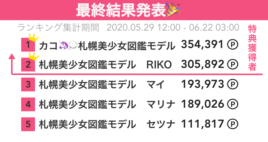 1.各キャストごとに、動画応援ランキング上位2名(1位・2位)のユーザーへ