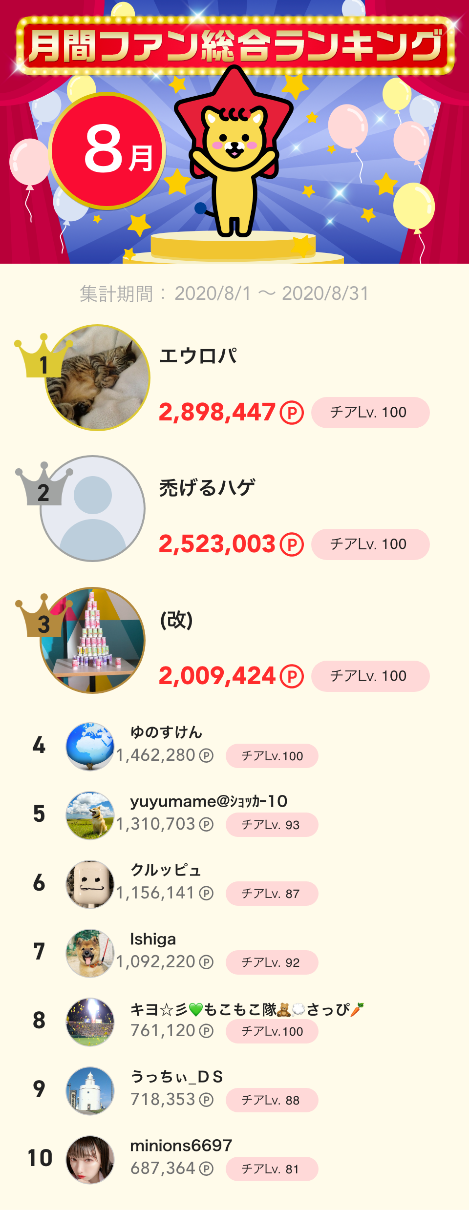 8月度月間ファン総合ランキング👑