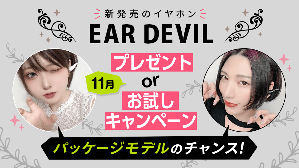 2020年10月20日 期間延長!【11月】新発売の完全ワイヤレスイヤホン「EAR DEVIL」プレゼントorお試しキャンペーン ■概要 ※レンタルの募集期間延長!※前回も好評だった、完全ワイヤレスイヤホン EAR DEVILのパッケージモデル企画。11月のパッケージモデルを決める第二回イベントが開催決定!https://appweb.mysta.tv/web/share/challenge/?challenge_id=3599まだEAR DEVILを持っていないけど、参加したい!という方のために、プレゼントorお試しキャンペーンを実施します。このイベントで勝ち上がり、11月の月間デビルちゃん、さらには年末の2020年のデビルクイーン(デビルキング)を決めるイベントに参加しよう! ■応募条件 11/6開始の11月の月間デビルちゃん決定イベントに参加すること。https://appweb.mysta.tv/web/share/challenge/?challenge_id=3599※イベント開始前の募集期間(10/30-11/6)に動画を投稿してください。 ■応募方法 プレゼントorお試しキャンペーンで募集しているのは下記3パターン2パターンです。 ①抽選で5名に商品をプレゼントします。 商品をご自宅へお送りします。※ご希望の色でご用意ができない場合がございます。 ②先着で10名に商品をレンタルします。 商品をご自宅へお送りします。11/6のイベント終了後に返却していただきます。※ご希望の色でご用意ができない場合がございます。 ③mystaオフィスでお試し&撮影会 10/31(土)にmystaでお試し&投稿動画の撮影会を行います。※交通費は各自でご負担いただきます。※コロナなどの影響により、急遽中止となる可能性もございます。※お友達同士で来て頂いた場合も、間隔をあけて撮影をお願いします。 ■期限 11月1日(日)まで ■応募フォーム ご応募はコチラから!(https://forms.gle/QEwt3FHMaksCkFU27) NEWS一覧へ