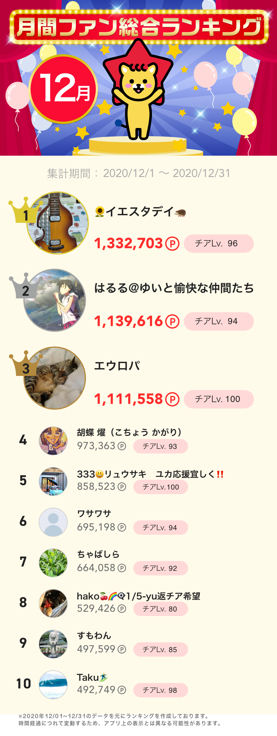 12月度月間ファン総合ランキング👑