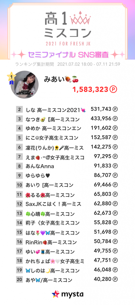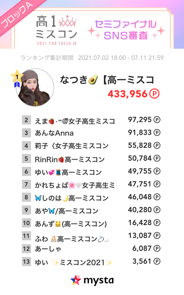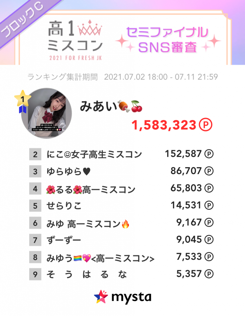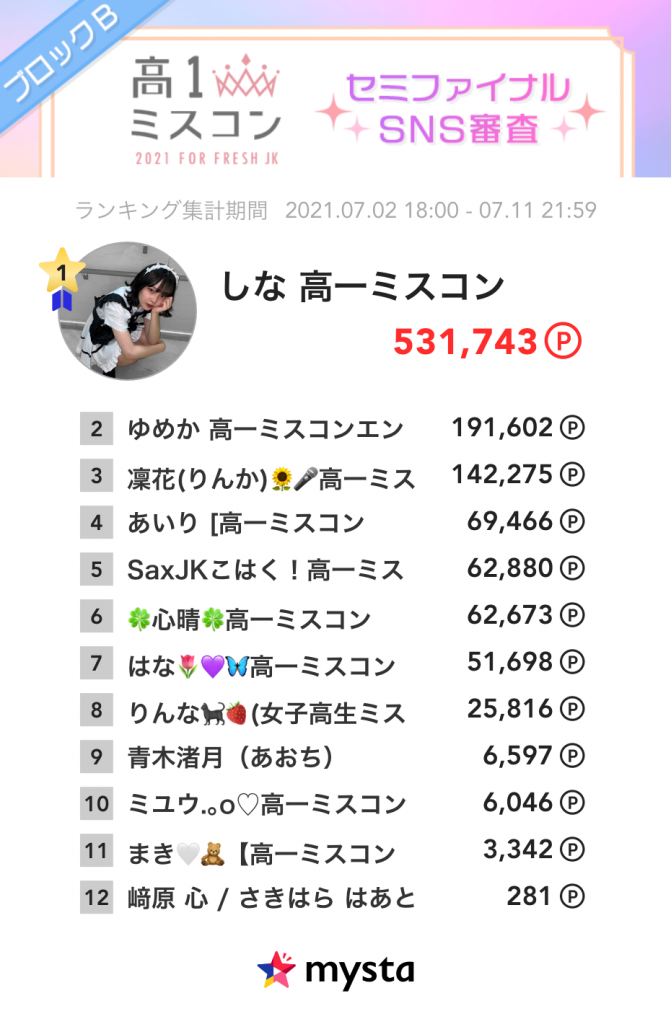 2021年7月8日 【総合&各ブロック累積ランキング】高一ミスコン2021 セミファイナル審査 【総合ランキング】7月11日 21:59 最終累計ポイント 【各ブロックランキング】7月11日 21:59 最終累計ポイント