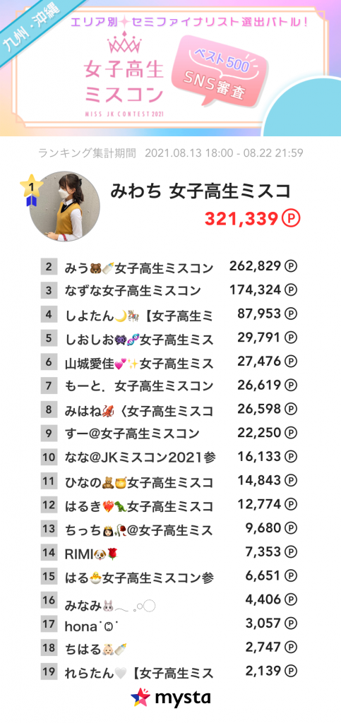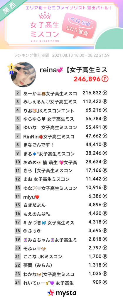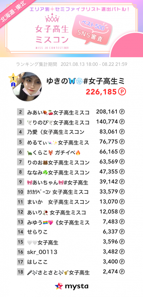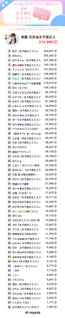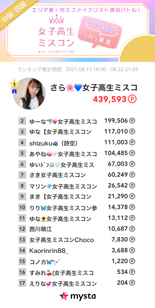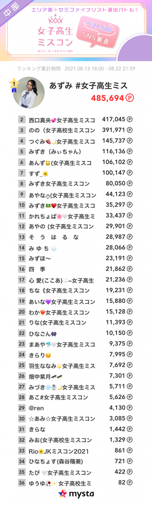 【各エリア累積ランキング】女子高生ミスコン2021 ベスト500 SNS審査〜エリア別セミファイナリスト選出バトル!〜