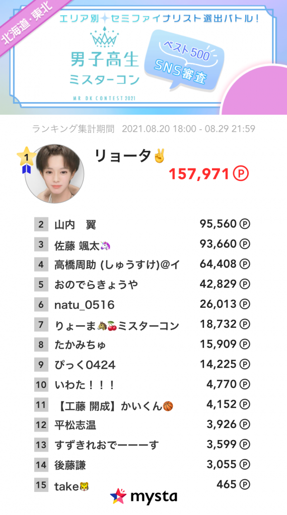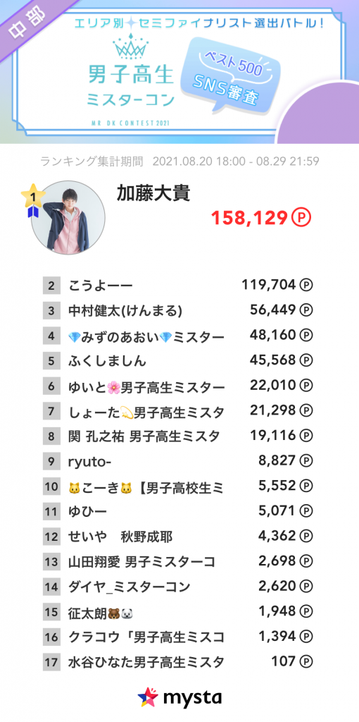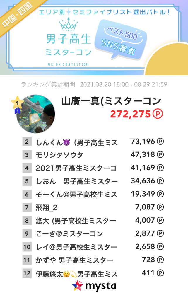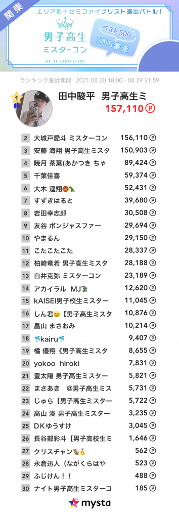 【各エリア累積ランキング】男子高生ミスターコン2021 ベスト500 SNS審査〜エリア別セミファイナリスト選出バトル!〜