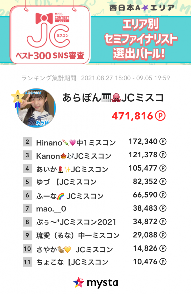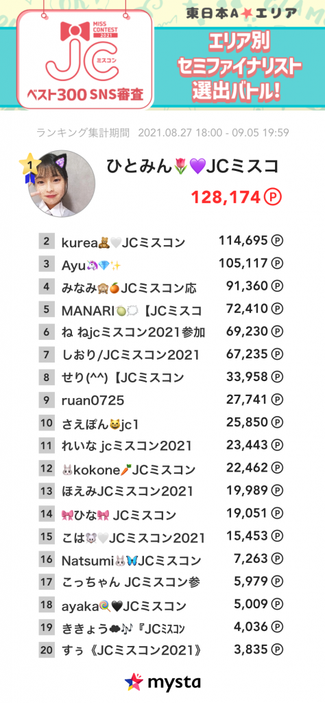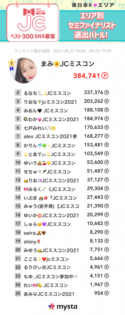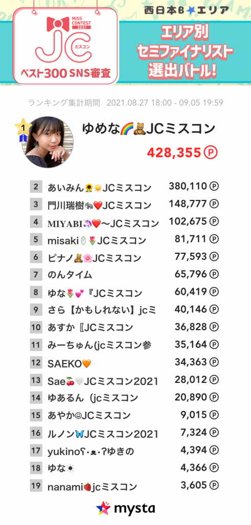 【各エリア累積ランキング】JCミスコン2021 ベスト300 SNS審査〜エリア別セミファイナリスト選出バトル!〜