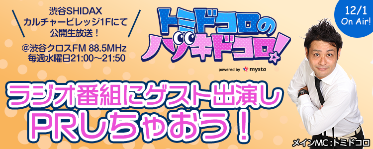 渋谷クロスFM(88.5MHz)で11月4日から毎週水曜日21:00~21:50にmystaの提供番組『トミドコロのノゾキドコロ!』の放送がスタート!