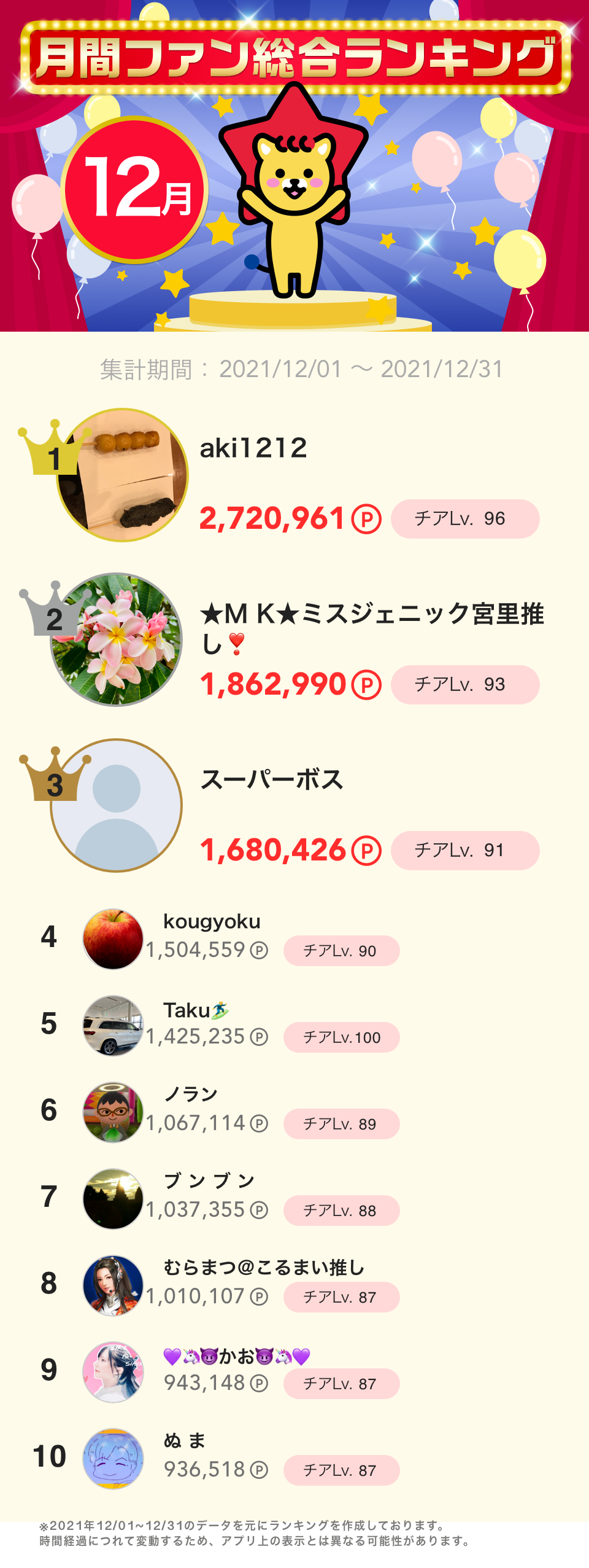 12月度月間ファン総合ランキング👑
