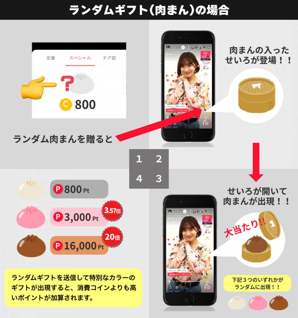 ランダムギフトは、送信されるポイント数がランダムで変動する特別なギフトです。ランダムギフトを送信して特別なカラーのギフトが出現すると、消費コインよりも高いポイントが加算されます。