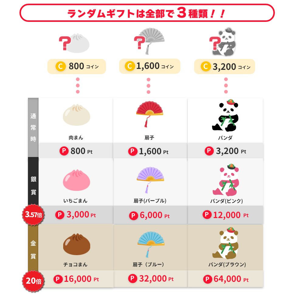 ※当たりの出現率12.5%、大当たりの出現率0.5%(ランダムギフト全体での出現確率です)