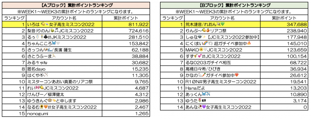 WEEK1・WEEK2・WEEK3 累計ポイント発表!!