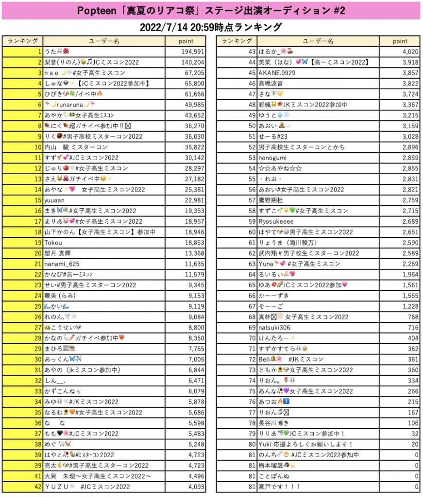 7/14(木) 20:59時点で下位50%は脱落(参加総数が奇数の場合は、進出者を切り上げます。)