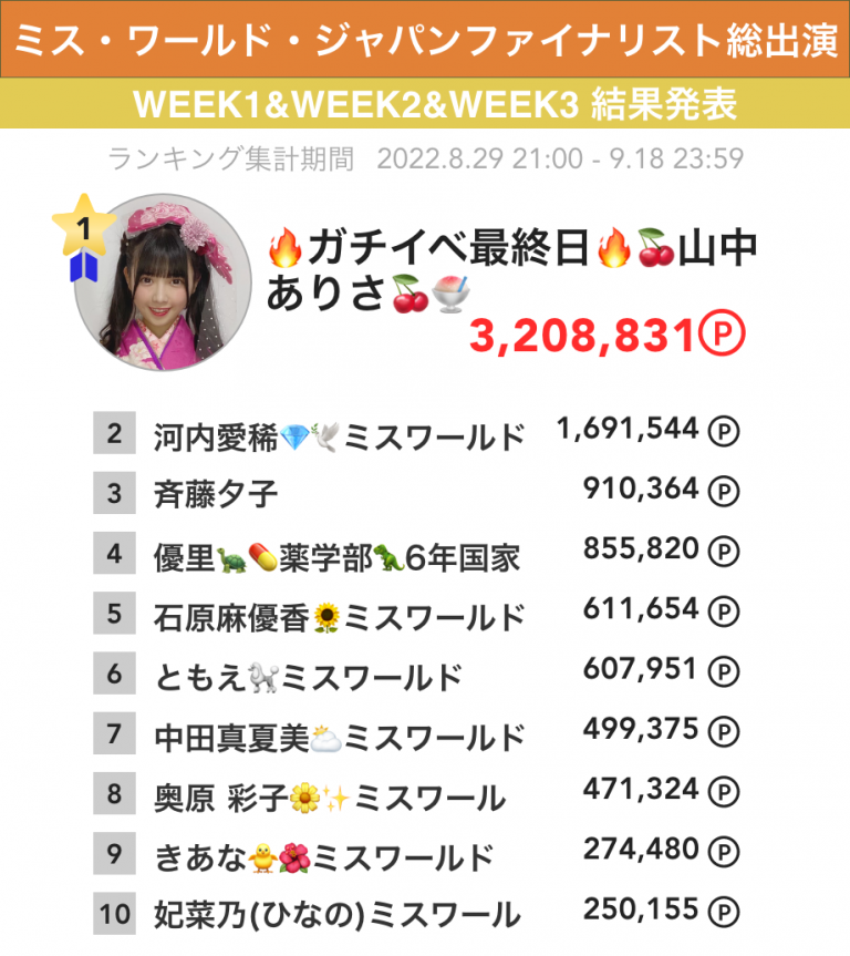 WEEK1〜WEEK3の累積ポイントランキング1位〜3位