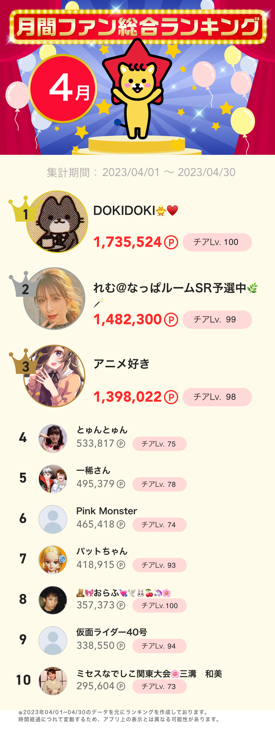 4月度月間ファン総合ランキング👑