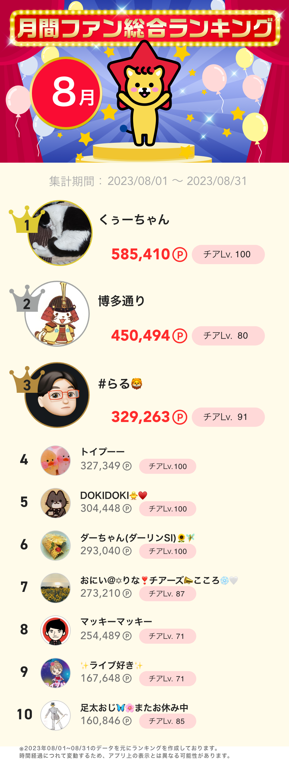 8月度月間ファン総合ランキング👑