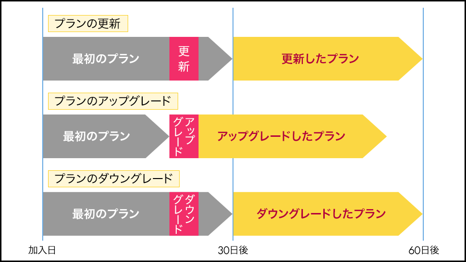プランに加入後、期限前に同じプランの更新予約・アップグレード・ダウングレードができます。
