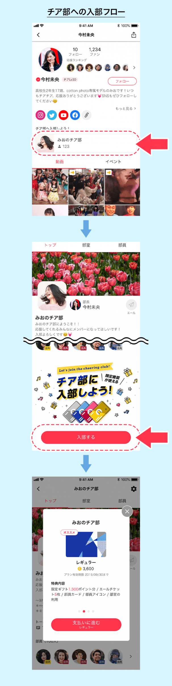 応援しているキャストがチア部を作成していると、キャストのプロフィール画面からチア部に入部することができます。