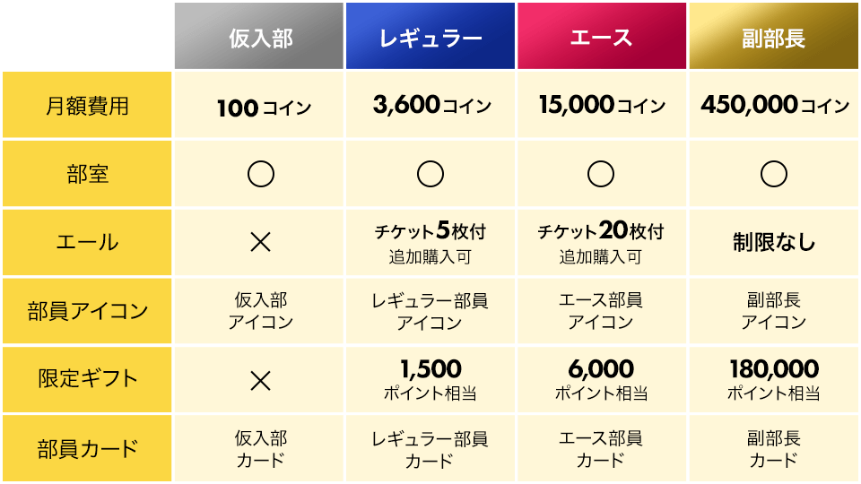 各プランに応じて特典があり、限定ギフトを贈れたり、部室という掲示板機能でイベントの作戦会議もできちゃいます!
