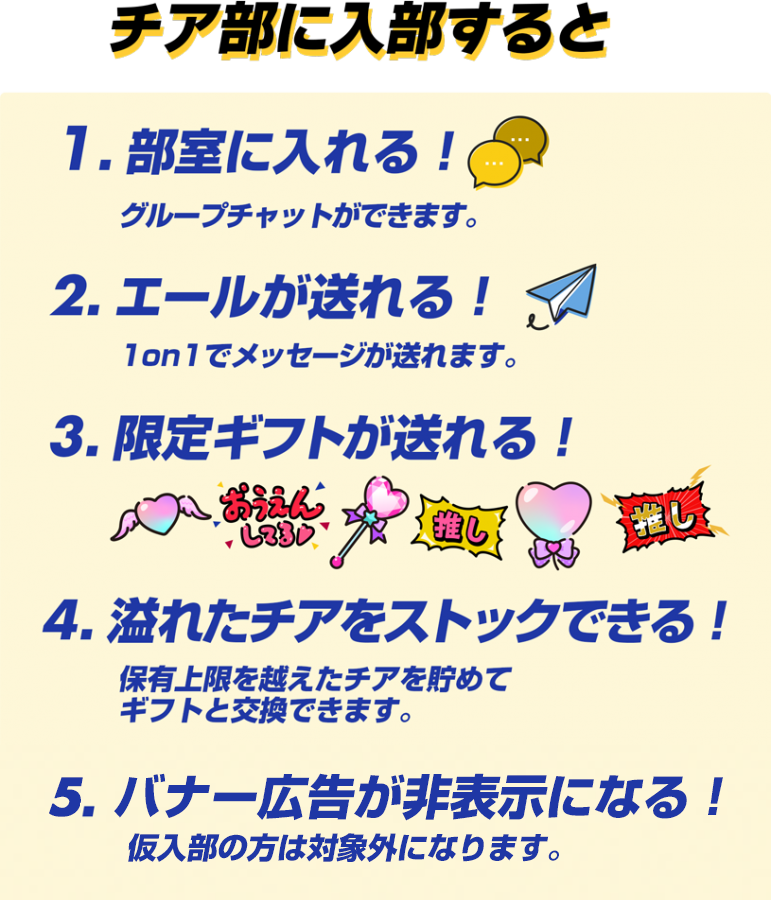 チア部に入部すると、プランに応じていくつかの特典機能が使えるようになります。