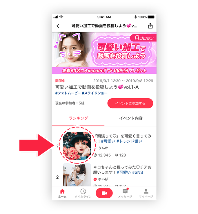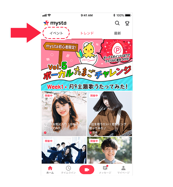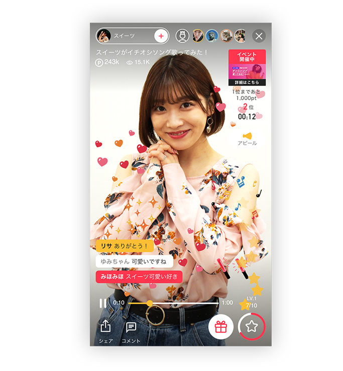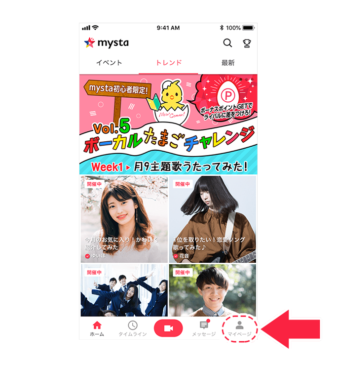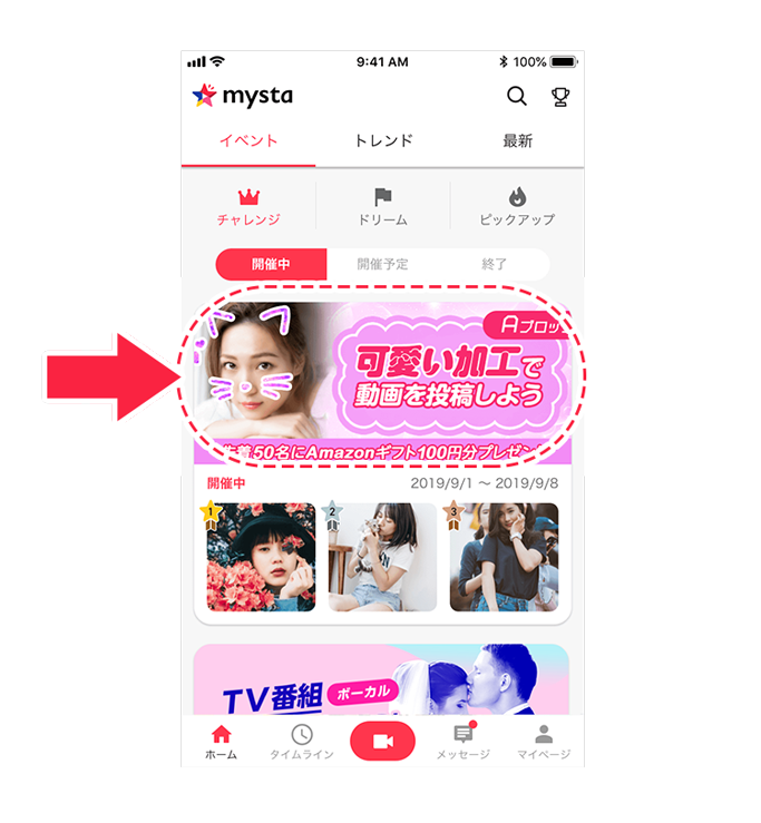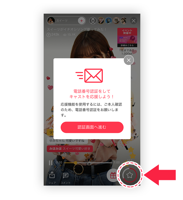 アプリの使い方(앱 사용법/How to use the application) 1. ログインする(로그인/Log in) ダウンロードした後、アプリを立ち上げ、マイページをタップします。 다운로드한 후 앱을 시작한 후, 마이페이지를 선택합니다.After downloading, launch the application and tap My Page. ログインをタップします。 로그인을 선택합니다. Tap Login. 新規登録から、 メールアドレス、パスワードを入力。 신규 등록에서 이메일 주소, 비밀번호를 입력. Enter your email address and password from the New Registration page. 2. 動画を見る(동영상 보기/Watch the video) ホームから、イベントをタップして、 イベントの画面へ。 홈에서 이벤트를 선택하면 이벤트 화면으로 이동합니다. From Home, tap Events to go to the Events screen. チャレンジから、 開催中のイベントを選びます。 챌린지에서 개최중인 이벤트를 선택합니다. Select a current event from the Challenge menu. 開催中イベントから見たい動画を選びます。 개최 중 이벤트에서 보고 싶은 동영상을 선택합니다. Select the videos you want to see from the ongoing events. 3. 応援する(응원하다/Support) 左下の星アイコンをタップすると、星が出て、ポイントが送れます。ポイントを送る前には、SMS認証が必要です。認証画面に進み、SMS認証します。 왼쪽 하단의 별 아이콘을 누르면 별이 나오고, 포인트를 보낼 수 있습니다. 포인트를 보내기 전에 SMS 인증이 필요합니다. 인증 화면으로 이동하여 SMS 인증을 합니다. Tap the star icon in the lower left corner to star and send points.SMS authentication is required before sending points.Go to the authentication screen and authenticate by SMS. SMS認証で、電話番号を入力すると、ショートメールで認証番号が送られてきます。届いた認証番号を入力すれば完了です。 SMS 인증에서 전화번호를 입력하면 SMS로 인증번호가 전송됩니다. 도착한 인증 번호를 입력하면 완료됩니다. With SMS authentication, enter your phone number and you will receive an authentication number by short mail.Enter the verification number received and you are done. 右下のプレゼントアイコンをタップするとギフトが送れます。 吾왼쪽 하단의 선물 아이콘을 선택하면 선물을 보낼 수 있습니다. Tap the gift icon in the lower right corner to send a gift. ギフトを選んで、タップ。 선물을 선택하고 탭. Choose a gift and tap. ギフトを送って応援しよう! 선물을 보내면 캐스트 순위가 상승합니다! 선물을 보내 응원하자! Support us by sending a gift!