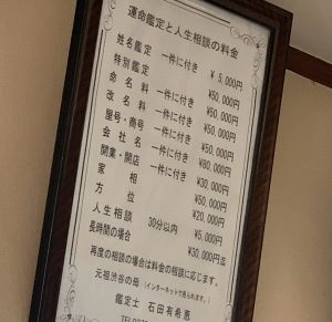 | 鑑定料金 | 対面鑑定:30分3,000円 延長10分ごと:1,000円 神社開運、産土神社・鎮守神社リサーチ:1人15,000円 メール鑑定:1件3,000円 電話鑑定:30分3,000円 10分延長ごと:1,000円 オンライン通話鑑定:1分150円 |