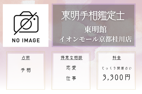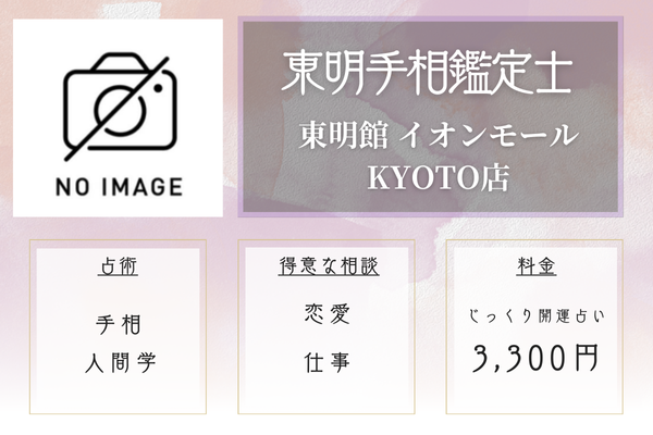 ![]() ![]() 東明手相鑑定士 | 東明館 イオンモールKYOTO店 手相専門 | 手相1,100円 開運2,200円 | 京都駅より徒歩1分 |