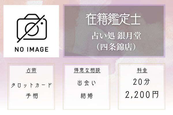 ![]() ![]() 在籍鑑定士 | 占い処 銀月堂(四条錦店) 手相・タロット・西洋占星術 | 20分2,200円 30分3,300円 | 四条烏丸駅より徒歩5分 |