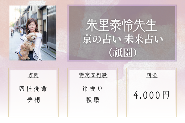 ![]() ![]() 朱里泰怜 | 京の占い 未来占い(祇園) 手相・易占・四柱推命 | 総合鑑定4,000円 60分10,000円+税 | 京都河原町駅から徒歩6分 |