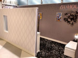 本屋やカフェ、雑貨店、スポーツショップなどが並ぶ商業施設の1F、エスカレーター横のブースで鑑定しています。