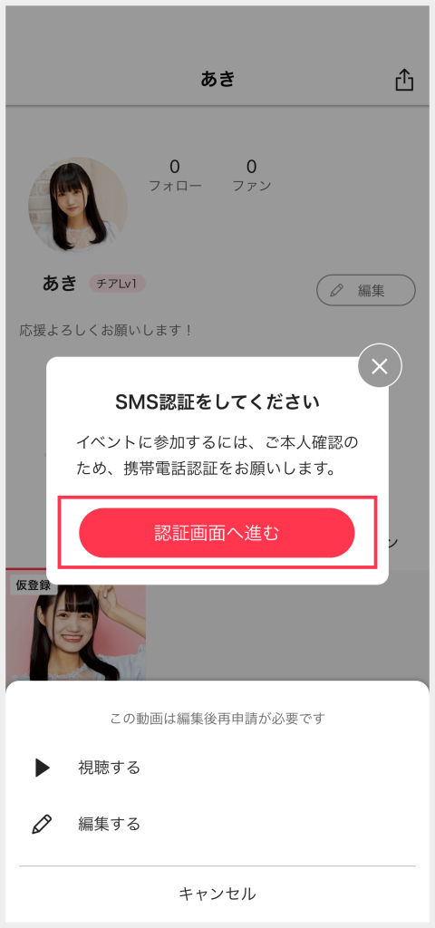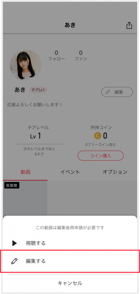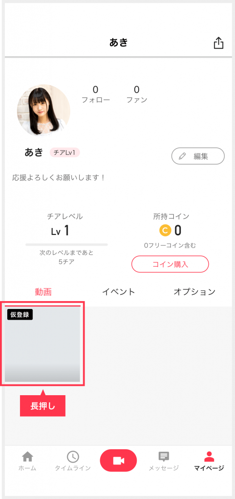 ④マイページの動画タブにあなたが仮応募した動画があるので、タップ(Androidは長押し)して編集に進もう。