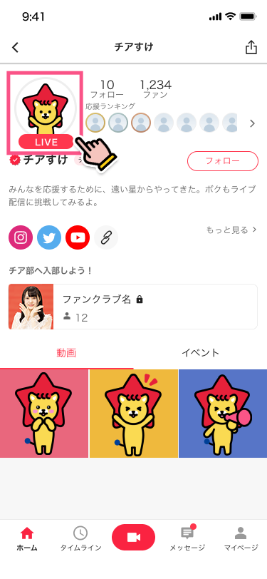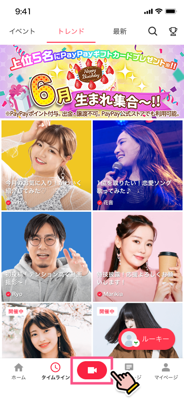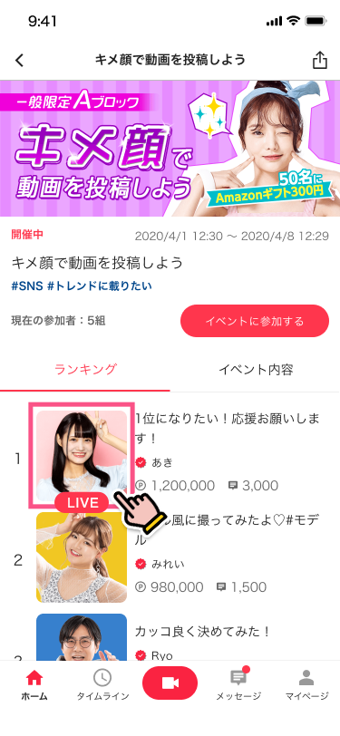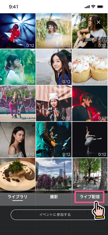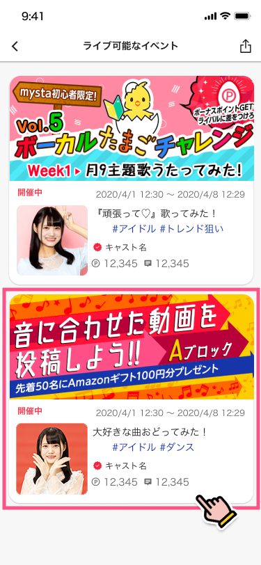 1.mysta LIVEとは 2.配信方法 3.視聴方法 4.配信にあたっての注意点 1.mysta LIVEとは mysta LIVEは、イベントやオーディションの盛り上がりをリアルタイムに共有するコミュニケーションツールです。mystaでは、今後も参加されるキャストの技能に着目し、アーカイブ動画による評価を推奨しており、本機能は開催中オーディション期間中、ごく限られた時間だけ解放される特別な機能となっております。 2.配信方法 STEP1 ライブ配信は、イベントに参加(アーカイブ動画を投稿)したイベントにのみ、配信可能です。 アーカイブ動画の投稿の仕方はこちら > 1. イベントに参加後→カメラマークをタップ 2. ライブ配信ボタンをタップ 3. 参加中のイベント一覧のなかから、ライブ配信する動画を選ぶ STEP2 ライブ配信ボタンをタップ STEP3 ライブを配信 コメントをこまめにチェック! STEP4 ライブの終了 ※ライブ配信はイベント終了時間の30分後に自動で終了となります 3.視聴方法 ライブの視聴方法は、アーカイブ動画のユーザーアイコンまたは、ユーザープロフィールのユーザーアイコンから視聴が可能です。 4.配信にあたっての注意点 配信にあたっての注意点 ライブ配信機能は、アプリバージョン:6.4.1以降でご利用いただけます。 イベント開催期間中にのみ、ライブ配信を開始いただけます。 終了後にライブ配信を開始することはできませんので、ご注意ください。 配信開始時間について mysta LIVEは、参加されているイベント/オーディションごとに利用可能日時が異なります。詳しくは、イベント/オーディションページでご確認ください。(イベントによっては利用できない場合もございます) 配信ガイドラインについて 基本的には、通常のアーカイブ動画の禁止事項は、ライブ配信でも同様のルールです。加えて、ライブ配信に限り下記の禁止事項を設けております。寝落ち、放置などコミュニケーションが取れない状態での配信カラオケ店での配信アイテムや権利などと引き換えに、現金、商品、権利を要求する行為及び、現金、商品、権利などと引き換えにアイテムや権利を要求する行為違反した場合は、配信の強制終了、またイベント/オーディションの参加権利の剥奪や、アカウントの停止処分などを行う場合がありますので、ご注意ください。 未成年による配信時間の制限について 15歳未満:20時まで 16歳未満:21時まで 18歳未満:22時まで ※18歳未満の配信者は、22時以降(配信者が日本国外から配信する場合は現地時間で22時以降)ライブストリーミング配信を実施してはなりません。オーガナイザーは、18歳未満の配信者に対し22時以降ライブストリーミング配信を実施させないよう指示・監督を行うものとします。 mystaでLIVE配信を楽しもう!!