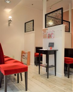 店内に入るとアンティークな受付カウンター、プチゴージャスなソファー、シャンデリアなどのインテリアで、おしゃれで清潔感のある空間です。