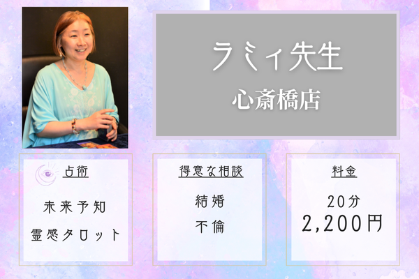 未来予知、霊感タロット、スピリチュアルリーディングで、流れの切り替わりや勝負のタイミングを特定する助言が強みとするラミィ先生。