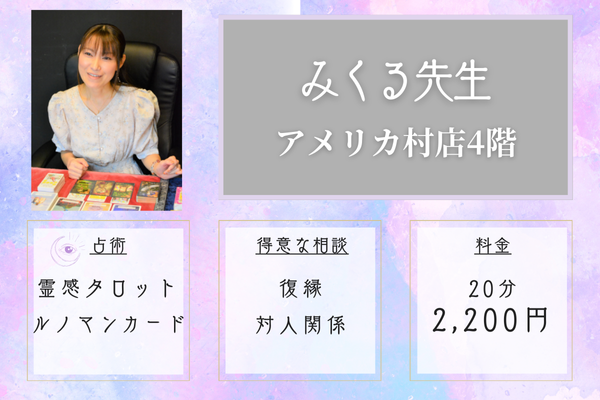 霊感タロットやルノルマン、オラクルで、高次元からのメッセージをカードに降ろして展開するスタイルが特徴的な、みくる先生。