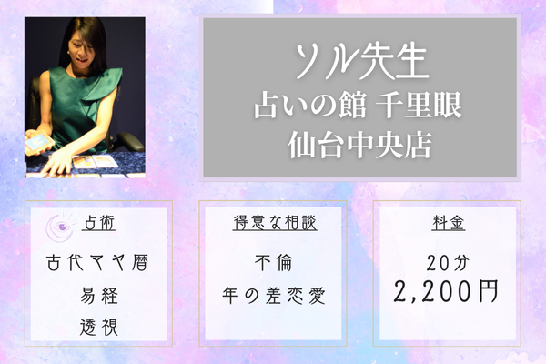 ソル先生は千里眼仙台中央店で人気の占い師で、透視とレイキヒーリングを組み合わせた独特な鑑定スタイルが特徴。