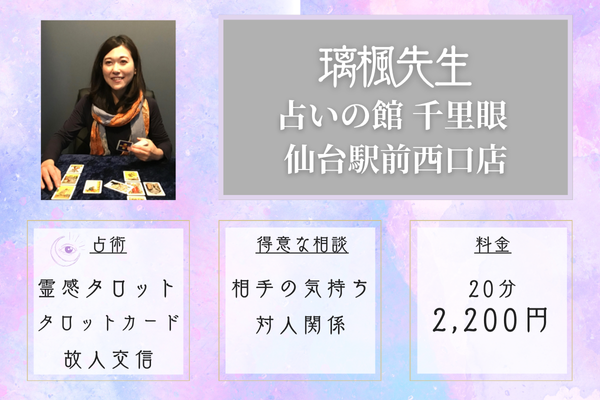 千里眼仙台駅前西口店で人気の占い師で、透視とタロットを組み合わせた鑑定スタイルが特徴の璃楓先生。