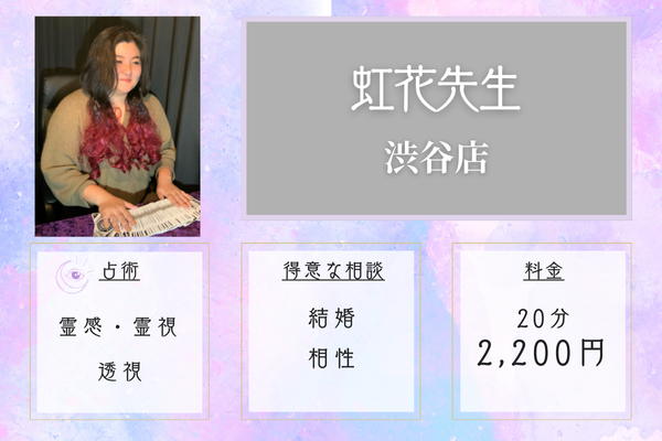 虹花先生は、物心ついた頃から霊視能力を持ち、約20年以上口コミのみで鑑定を続けてきた実力派占い師。