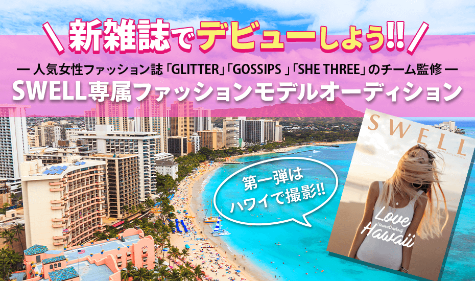 人気女性ファッション誌の編集チームが手掛ける新ファッション誌『SWELL』専属モデルオーディションの募集を行います! あああああああああああああああああああああああああああああああああああああああああああああああああああああああああああああああああああああああああああああああああああああああああああああああああああああああああああああああああああああああ オーディション概要 募集内容 女性 年齢制限なし プロダクションの所属、無所属問わず可 日本国内在住の方 外国籍の方も可 事務所所属の方:事前に応募する旨を事務所に確認してください。 事務所所属の方:合格した場合でも所属事務所を変える必要はございません。 未成年の方:保護者の方の同意が必要になります。 募集人数 合計5名 審査員特別賞として1名追加される場合がございます。 特典 対象:2名 審査員特別賞として1名追加される場合がございます。 『 SWELL~ハワイ編~ 』ファッション誌の撮影モデル ハワイ現地での撮影 今後シリーズ化が予定されているSWELLの専属モデル ファッション誌完成記念お渡し会参加権(都内近郊) ハワイまでの渡航、宿泊費用は特典に含まれるためご自身の費用負担は一切ありません。 決勝では審査員特別賞としても選出される場合がございます。 専属モデルではなく、今回のみのモデルとしての活動も可能です。 対象:3名 『 SWELL~ハワイ編~ 』ファッション誌の撮影モデル 国内都内スタジオでファッションモデルとして撮影 今後シリーズ化が予定されているSWELLの専属モデルへの最終面接権 決勝に進んだ方から審査員賞で3名を選出 交通費の支給はございません。 オーディションスケジュール 期間 内容 2020年2月8日(土) イベント&オーディション発表&エントリー開始 2020年3月8日(日)23:59 エントリー締切 2020年3月10日(火)20:00~ ブロック分け発表&予選動画投稿開始 2020年3月16日(月)12:30~3月22日(日)23:59 予選 2020年3月24日(火)20:00~ ブロック分け発表&準決勝動画投稿開始 2020年3月30日(月)12:30~4月5日(日)23:59 準決勝 2020年4月7日(火)20:00~ ブロック分け発表&決勝動画投稿開始 2020年4月13日(月)12:30~4月19日(日)23:59 決勝 2020年4月24日(金) 審査員賞発表(決勝3位~10位の中から対象者がいる場合) 5月25日週 ハワイ撮影※予定は変更になる場合がございます。予めご了承ください。※詳細は後日お送りいたします。 オーディション内容 LINE公式アカウントにて発表します。 エントリー方法 LINE公式アカウントに登録 mystaをダウンロード&アカウント登録 LINE公式アカウントでご案内する応募フォームに記入&提出 SWELLとは WHAT’S SWELL HAPPINESS STYLE MAGAZIN 旅を基軸に、ライフスタイル、ファッション、カルチャーを提案していく、女性のための“トラベル&スタイル・マガジン”。クラシックとカジュアルをシンクロさせ、旅の新しい楽しみ方、 そしてライフスタイルに連動できる誌面構成。 ファッション、ビューティ、ライフをベースに、トラベルスポットを連動させ、 バリエーション豊富な誌面構成。 雑誌独自の目線で、トラベルガイド誌では得られない、臨場感を演出します。 Travel 毎号、海外人気エリアをまるごと1号でフィーチャーします。通常のトラベル誌とは違った、スポットやFOODなど臨場感ある誌面構成。 Fashion その号の海外スポットに合わせたファッションスタイルを提案。時代に合わせたリアルクローズスタイル。 Culture 海外のカルチャーもしっかりフィーチャー。自分発見につながるその土地の文化から音楽、スポーツまで幅広く紹介。 Beauty 日本では知ることの出来ない、現地ビューティを紹介。ヘルシーなものからケミカルなのものでフィーチャーしていきます。 WHAT’S SWELLTHE CHIEF EDITOR 編集長/前原静蘭(まえはらせいら)株式会社S Meria 代表取締役。エディター。2012年早稲田大学国際教養学部卒業後、カエルム株式会社に入社し『GLITTER』編集部に在籍。巻頭特集からタイアップ、海外撮影まで多岐に渡り携わる。その後、メンズファッション雑誌も手掛けてみたいという想いから、2015年より株式会社センスに入社、『SENSE』編集部に所属。退社後、流行に合わせ一時オウンメディアを開設、ウェブメディアに関して学んだ後フリーランスとして独立。2018年4月に創刊となったファッション誌『NINE CONTINUE』編集長に就任。引き続き、『GLITTER』『GOSSIPS』『SHEL’TTER』『MERY』『SENSE』などのファッション誌のほか、ウェブメディア、ファッションカタログなどを手掛けている。 渡辺美優紀とは 渡辺美優紀(わたなべみゆき)2010年にNMB48第1期オーディションに合格し活動を開始。NMB48のデビューシングル「黒髪絶対少女」でセンターを務め、2012年からはAKB48チームBも兼任。2016年8月にNMB48を卒業。2018年9月、東京・大阪で『1st LIVE TOUR 2018~Milky Landだよね~』を開催し、約2年ぶりのステージで復帰を果たす。2019年4月には、ワーナーミュージック・ジャパンよりファーストソロアルバム「17%」を発売し全国ツアーを開催。雑誌にテレビにと活動