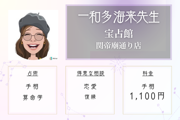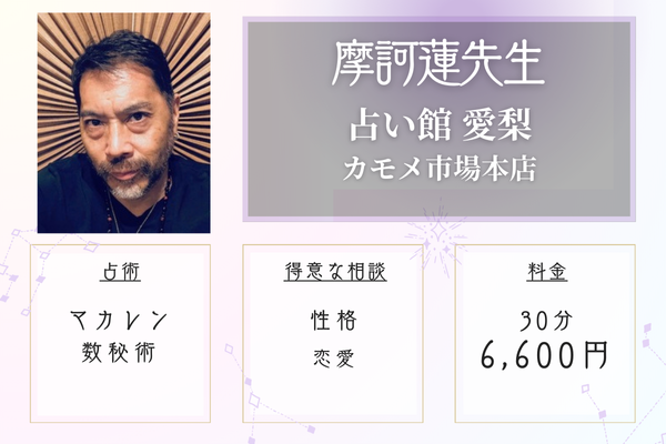 ![]() ![]() 摩訶蓮先生 | 占い館 愛梨 カモメ市場本店 | 30分 6,600円 | 元町・中華街駅から徒歩5分 |