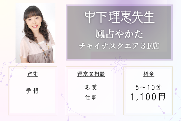 ![]() ![]() 中下 理恵先生 | 鳳占やかた チャイナスクエア3F店 | 8〜10分 1,100円〜 | 元町・中華街駅から徒歩5分 |